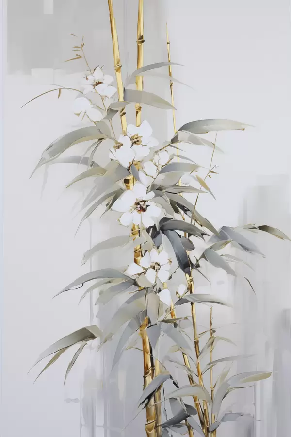 Poster Abstrakcyjne łodygi bambusa z żółtymi akcentami, delikatnymi białymi kwiatami i jasnozielonymi liśćmi, szare tło Nr f47039