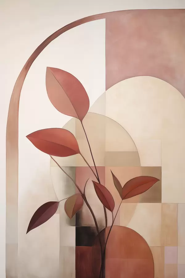 Poster Abstrakcyjna roślina o czerwonych liściach na tle geometrycznych kształtów i delikatnych, stonowanych kolorów Nr f47040