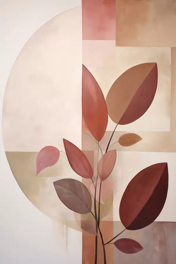 Plakat Abstrakcyjna roślina o czerwonych liściach na tle geometrycznych kształtów i delikatnych, stonowanych kolorów f47041