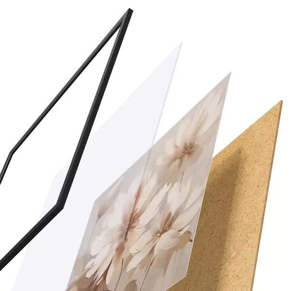 Plakat składa się z ramy, pleksi, wydrukowanego obrazu i podkładu z płyty wiórowej. Plakat można natychmiast zawiesić na ścianie dzięki uchwytom z tyłu.