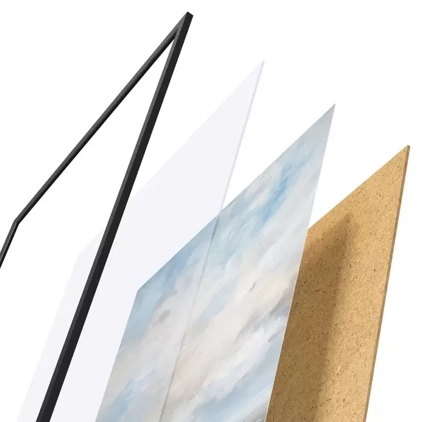 Plakat składa się z ramy, pleksi, wydrukowanego obrazu i podkładu z płyty wiórowej. Plakat można natychmiast zawiesić na ścianie dzięki uchwytom z tyłu.