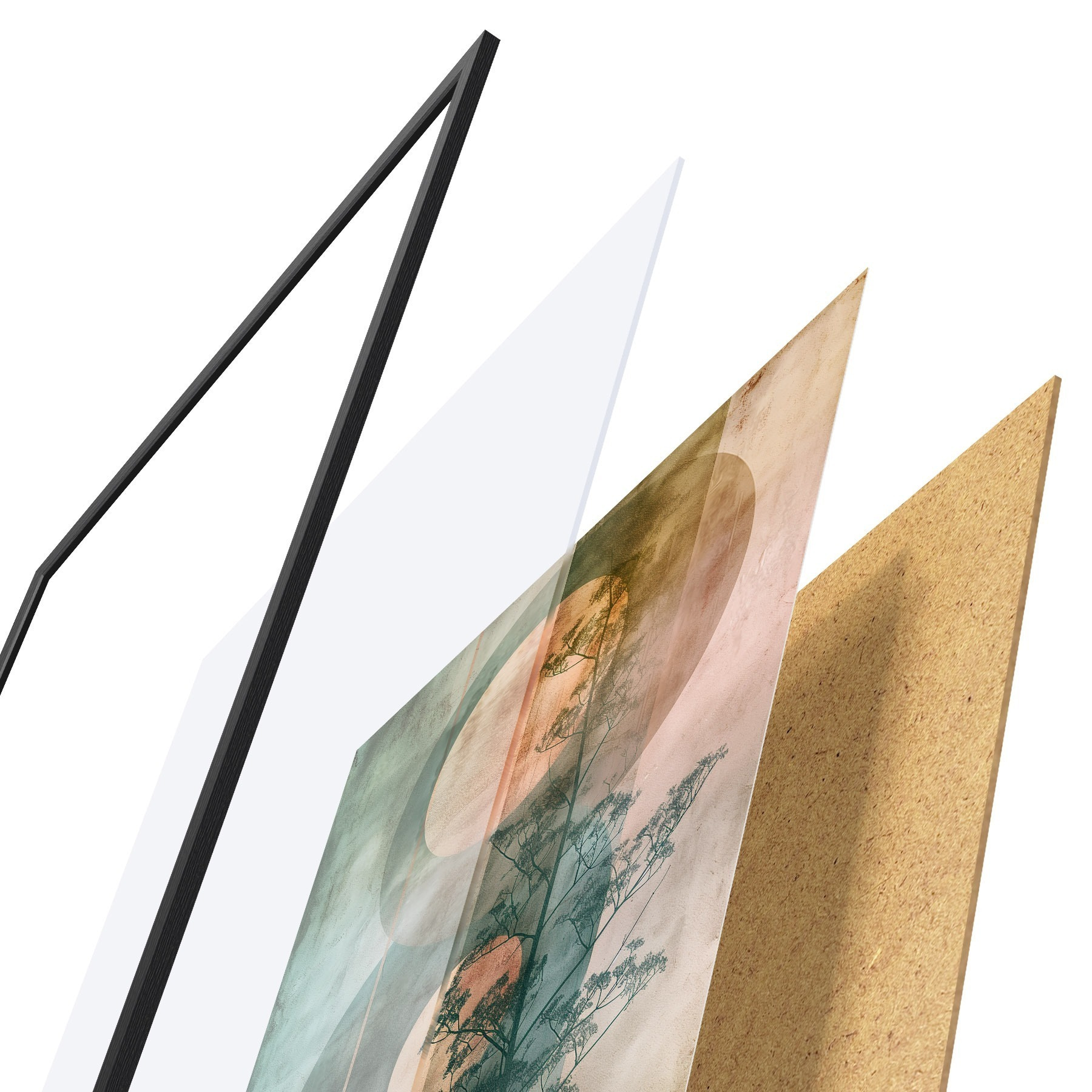 Plakat składa się z ramy, pleksi, wydrukowanego obrazu i podkładu z płyty wiórowej. Plakat można natychmiast zawiesić na ścianie dzięki uchwytom z tyłu.