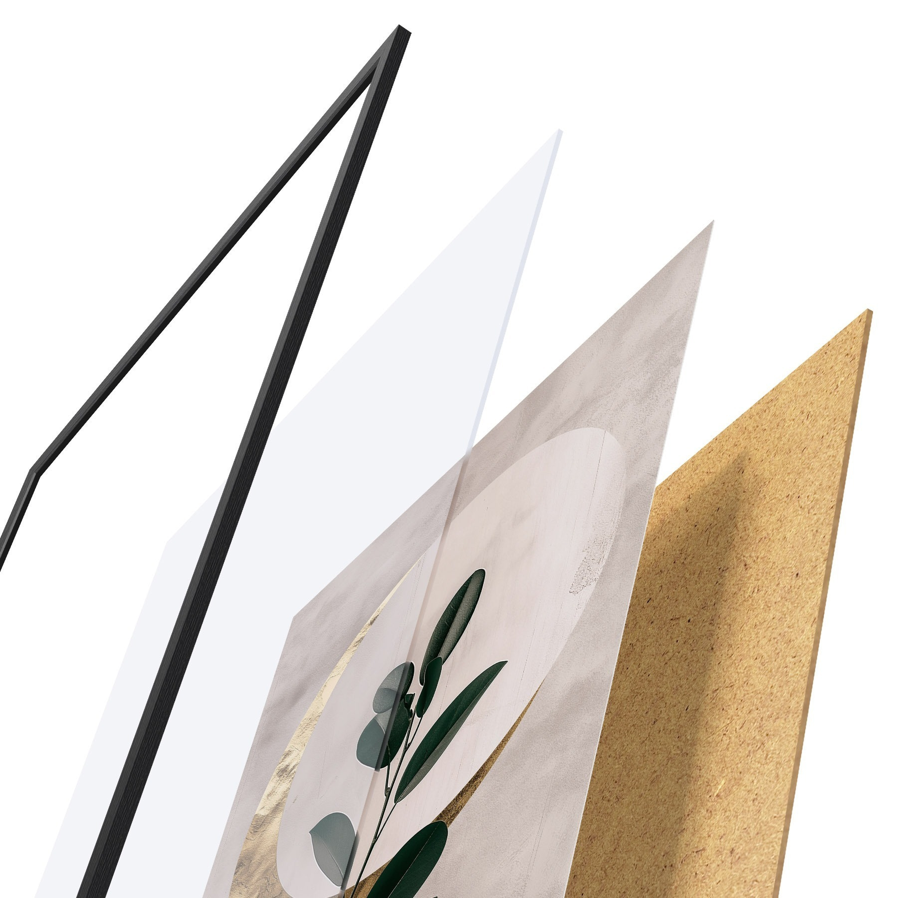Plakat składa się z ramy, pleksi, wydrukowanego obrazu i podkładu z płyty wiórowej. Plakat można natychmiast zawiesić na ścianie dzięki uchwytom z tyłu.