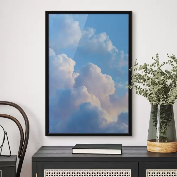 Plakat Objętościowe chmury w delikatnej niebiesko-różowej palecie barw w fotorealistycznym stylu grafiki cyfrowej. f47088