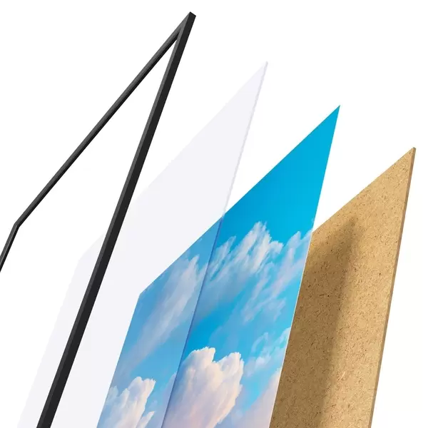 Plakat składa się z ramy, pleksi, wydrukowanego obrazu i podkładu z płyty wiórowej. Plakat można natychmiast zawiesić na ścianie dzięki uchwytom z tyłu.