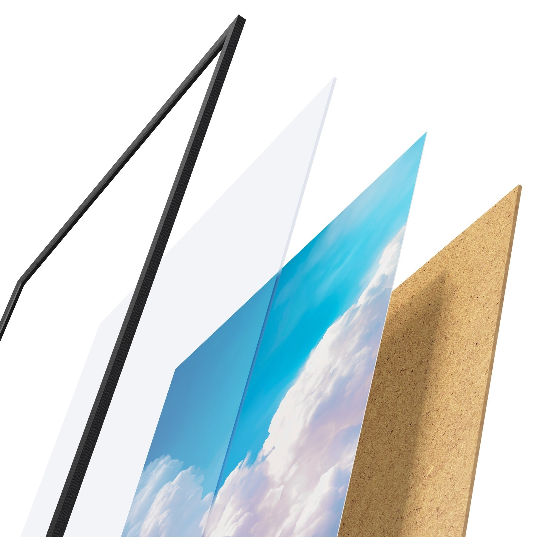 Plakat składa się z ramy, pleksi, wydrukowanego obrazu i podkładu z płyty wiórowej. Plakat można natychmiast zawiesić na ścianie dzięki uchwytom z tyłu.