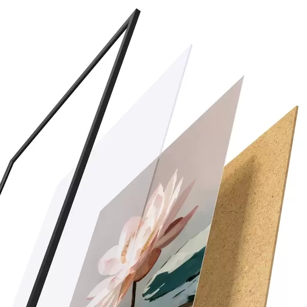 Plakat składa się z ramy, pleksi, wydrukowanego obrazu i podkładu z płyty wiórowej. Plakat można natychmiast zawiesić na ścianie dzięki uchwytom z tyłu.