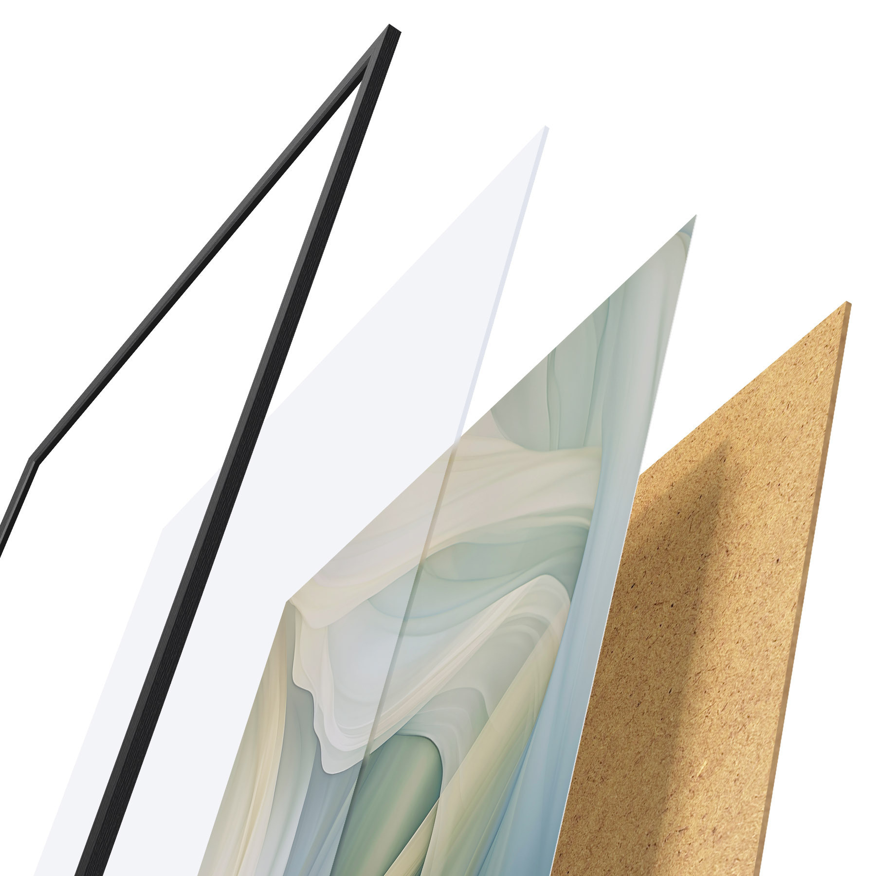 Plakat składa się z ramy, pleksi, wydrukowanego obrazu i podkładu z płyty wiórowej. Plakat można natychmiast zawiesić na ścianie dzięki uchwytom z tyłu.