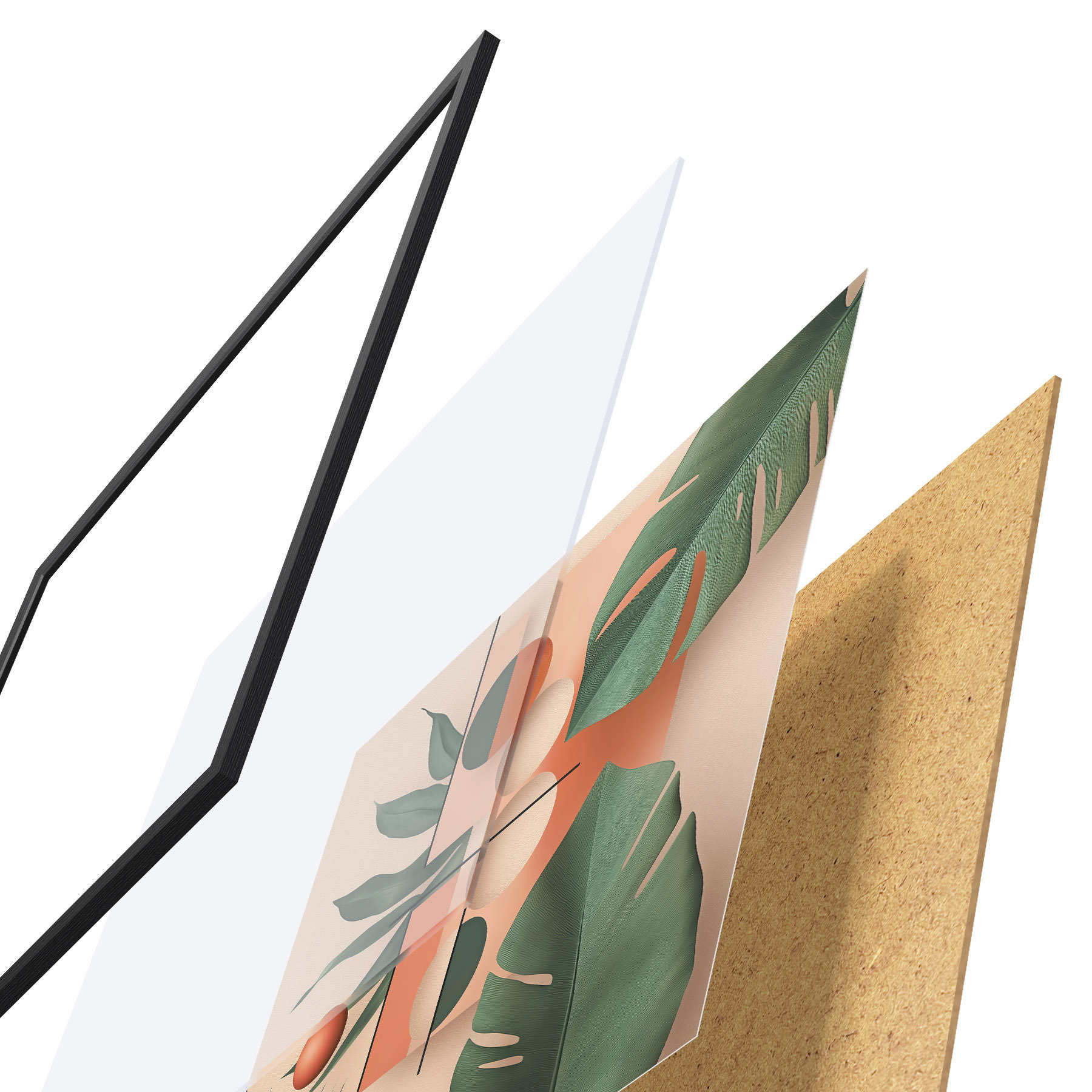 Plakat składa się z ramy, pleksi, wydrukowanego obrazu i podkładu z płyty wiórowej. Plakat można natychmiast zawiesić na ścianie dzięki uchwytom z tyłu.