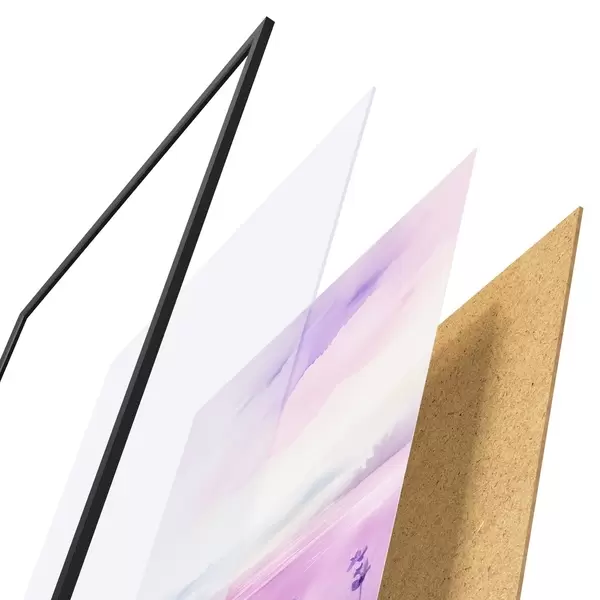 Plakat składa się z ramy, pleksi, wydrukowanego obrazu i podkładu z płyty wiórowej. Plakat można natychmiast zawiesić na ścianie dzięki uchwytom z tyłu.