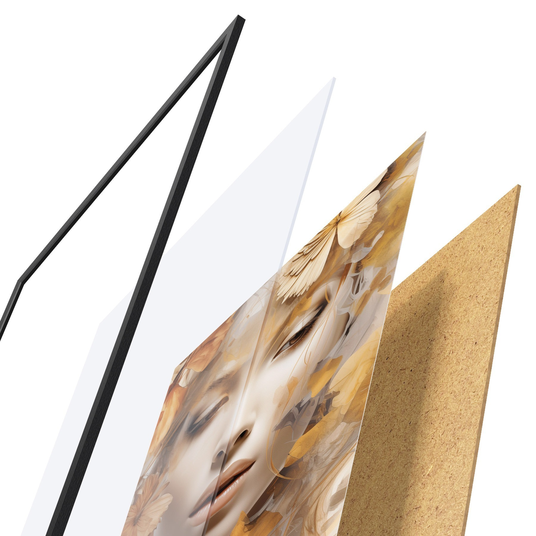 Plakat składa się z ramy, pleksi, wydrukowanego obrazu i podkładu z płyty wiórowej. Plakat można natychmiast zawiesić na ścianie dzięki uchwytom z tyłu.