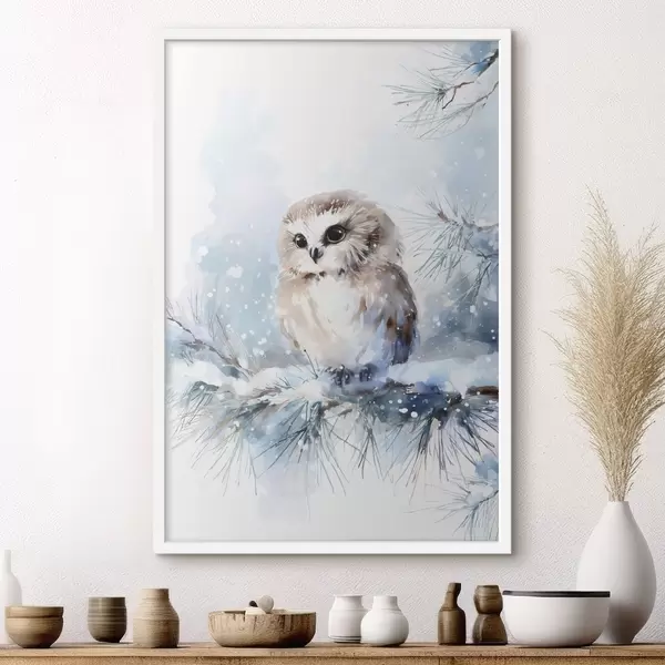 Poster urocza sowa na pokrytej śniegiem gałęzi sosny w stylu akwareli Nr f47115
