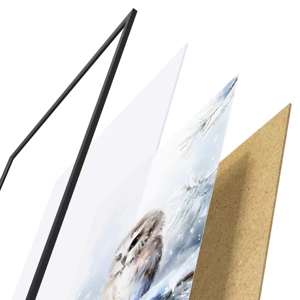 Plakat składa się z ramy, pleksi, wydrukowanego obrazu i podkładu z płyty wiórowej. Plakat można natychmiast zawiesić na ścianie dzięki uchwytom z tyłu.