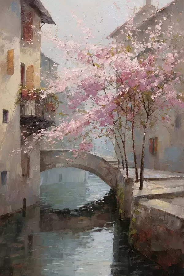 Poster romantyczny pejzaż miejski z kwitnącym drzewem w stylu malarstwa olejnego Nr f47127