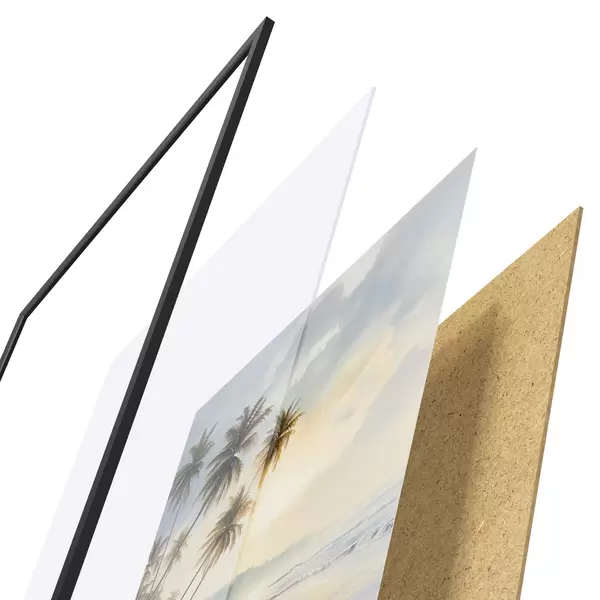 Plakat składa się z ramy, pleksi, wydrukowanego obrazu i podkładu z płyty wiórowej. Plakat można natychmiast zawiesić na ścianie dzięki uchwytom z tyłu.