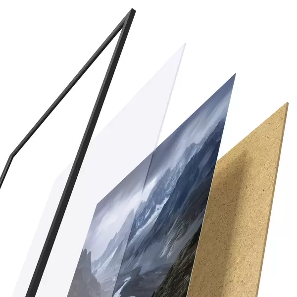 Plakat składa się z ramy, pleksi, wydrukowanego obrazu i podkładu z płyty wiórowej. Plakat można natychmiast zawiesić na ścianie dzięki uchwytom z tyłu.