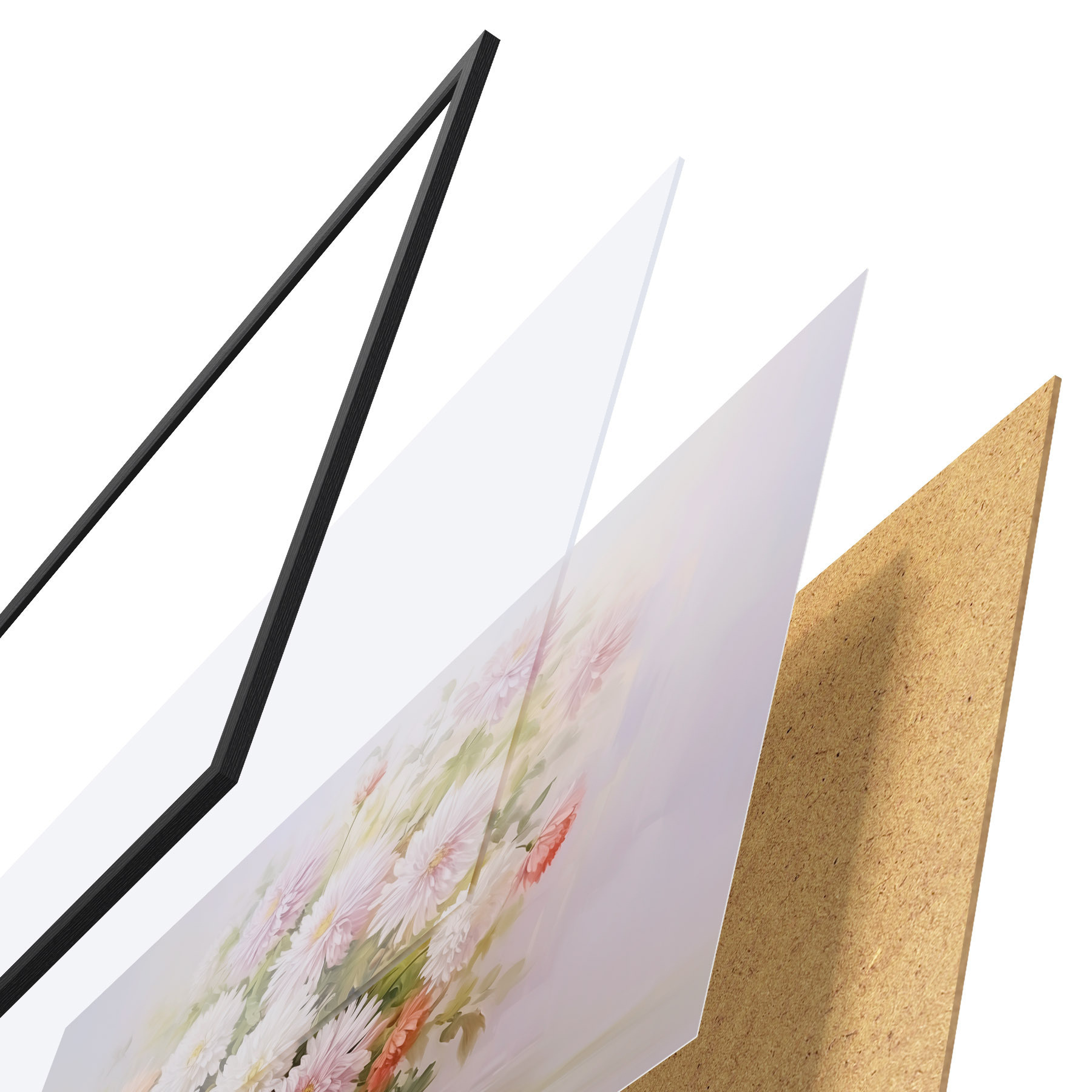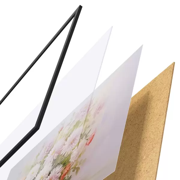 Plakat składa się z ramy, pleksi, wydrukowanego obrazu i podkładu z płyty wiórowej. Plakat można natychmiast zawiesić na ścianie dzięki uchwytom z tyłu.