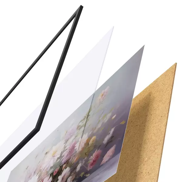 Plakat składa się z ramy, pleksi, wydrukowanego obrazu i podkładu z płyty wiórowej. Plakat można natychmiast zawiesić na ścianie dzięki uchwytom z tyłu.