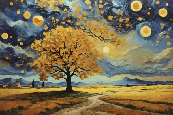 Plakat Krajobraz z drzewem i jasnym gwiaździstym niebem f47255