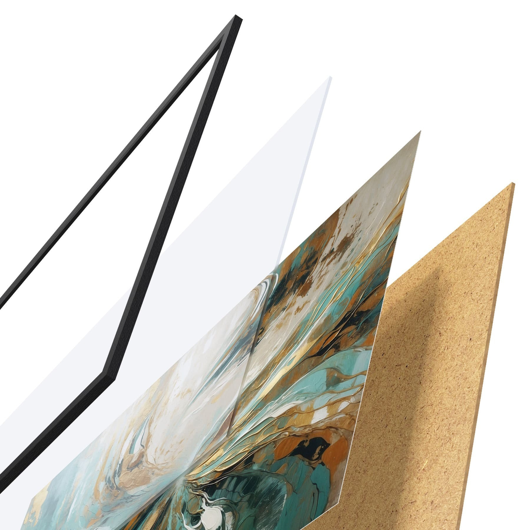 Plakat składa się z ramy, pleksi, wydrukowanego obrazu i podkładu z płyty wiórowej. Plakat można natychmiast zawiesić na ścianie dzięki uchwytom z tyłu.