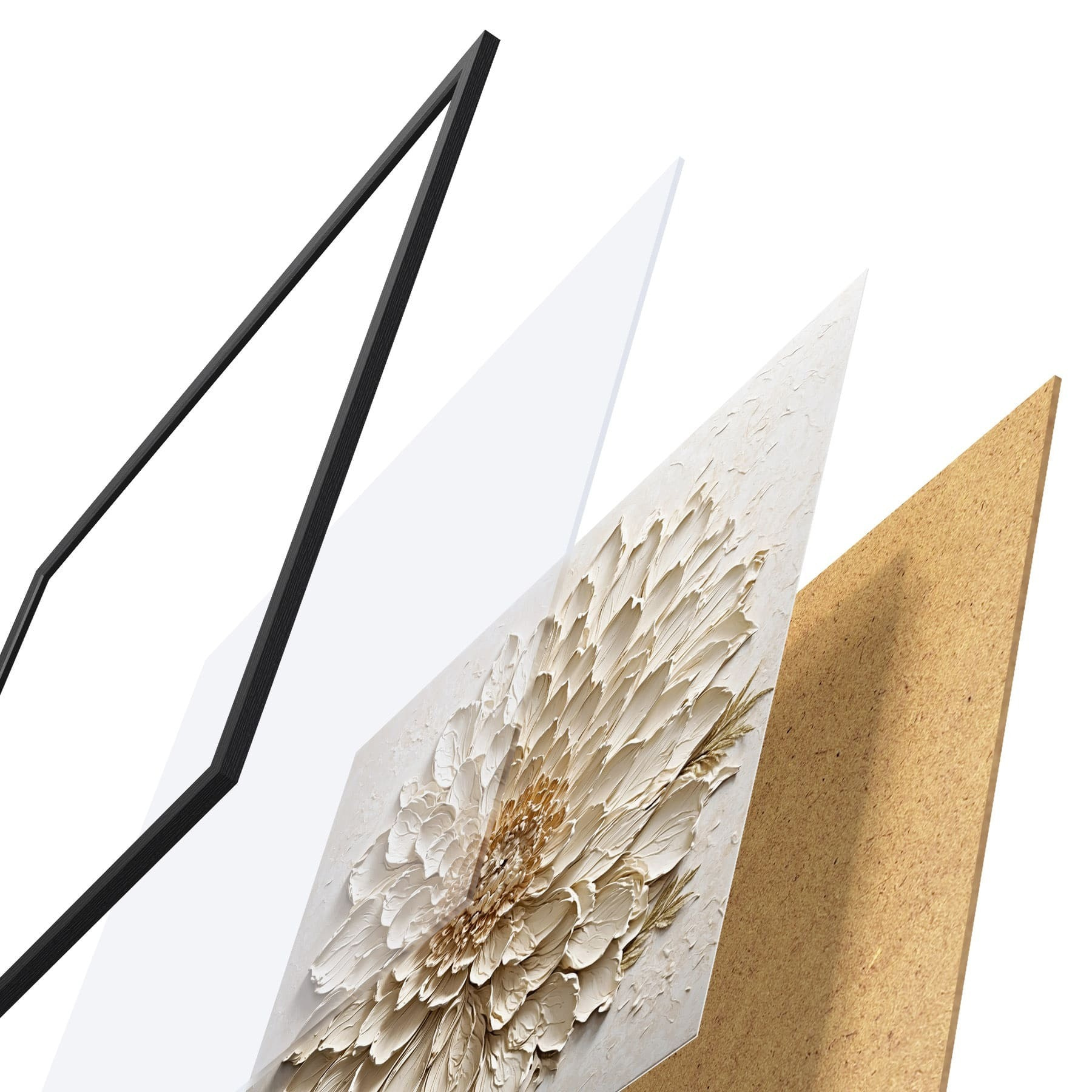 Plakat składa się z ramy, pleksi, wydrukowanego obrazu i podkładu z płyty wiórowej. Plakat można natychmiast zawiesić na ścianie dzięki uchwytom z tyłu.