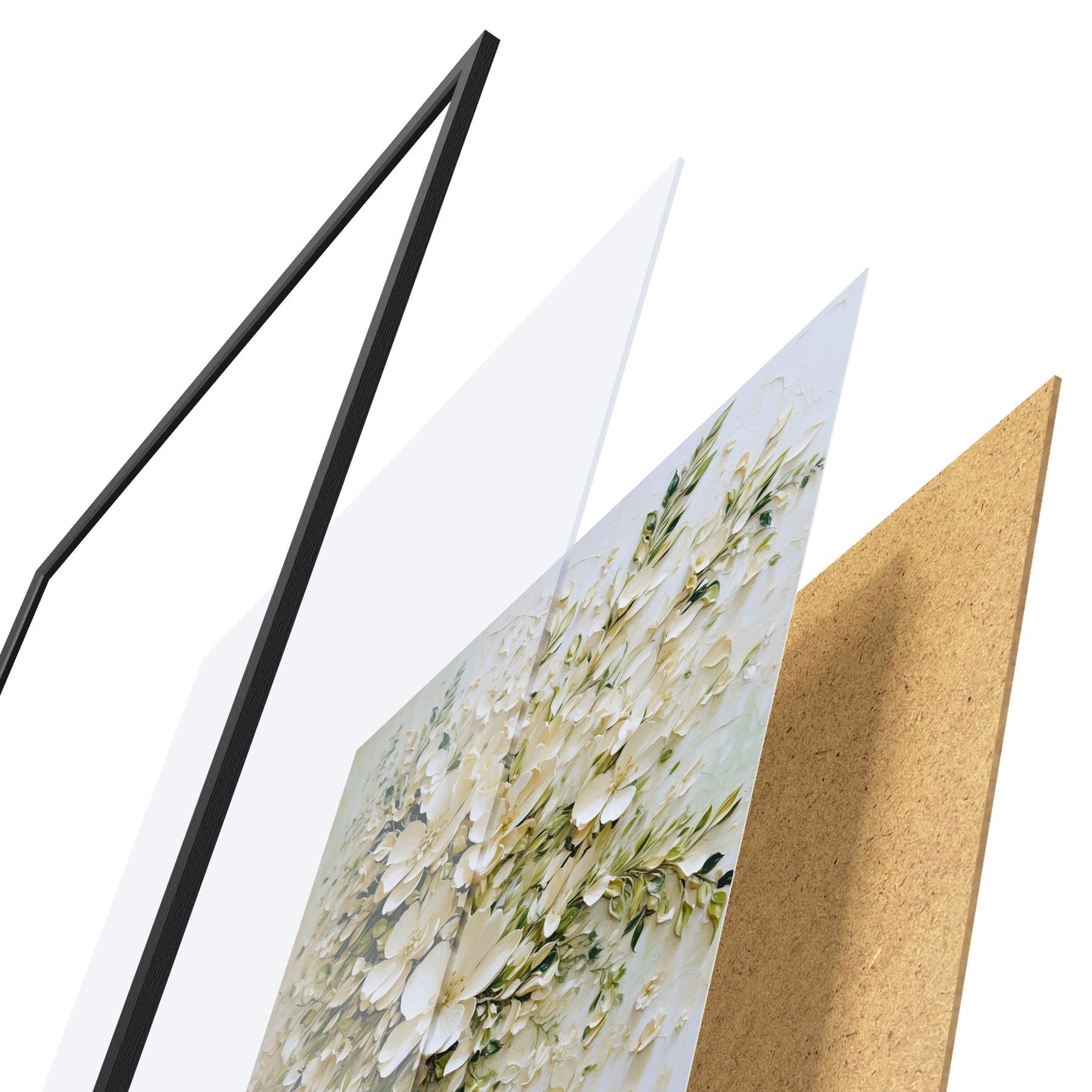 Plakat składa się z ramy, pleksi, wydrukowanego obrazu i podkładu z płyty wiórowej. Plakat można natychmiast zawiesić na ścianie dzięki uchwytom z tyłu.