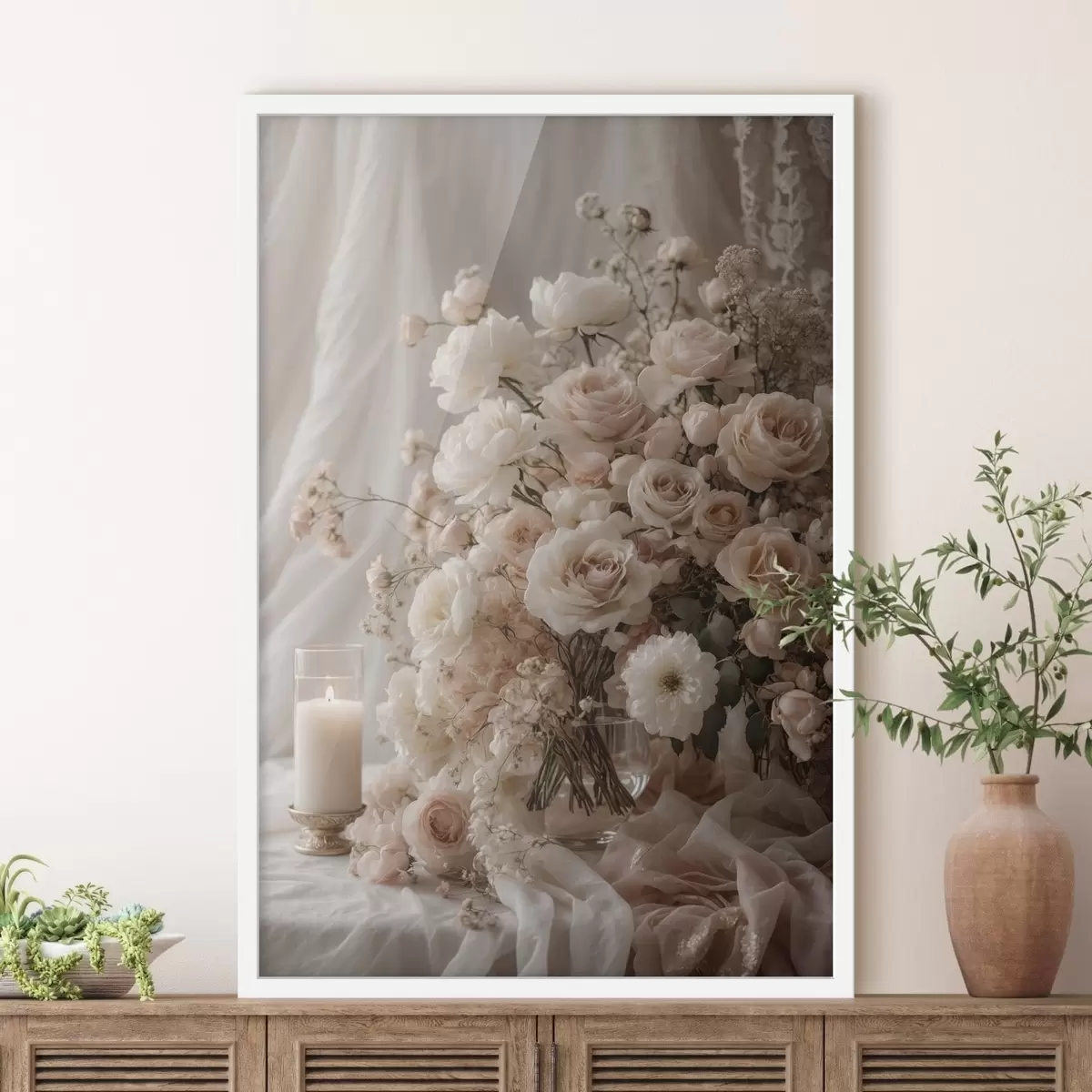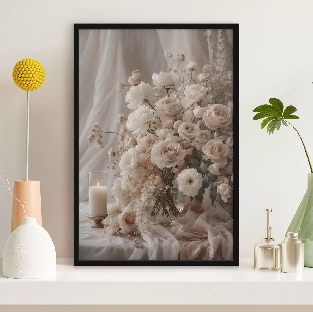 Plakat Kremowe kwiaty obok zapalonej świecy f47281