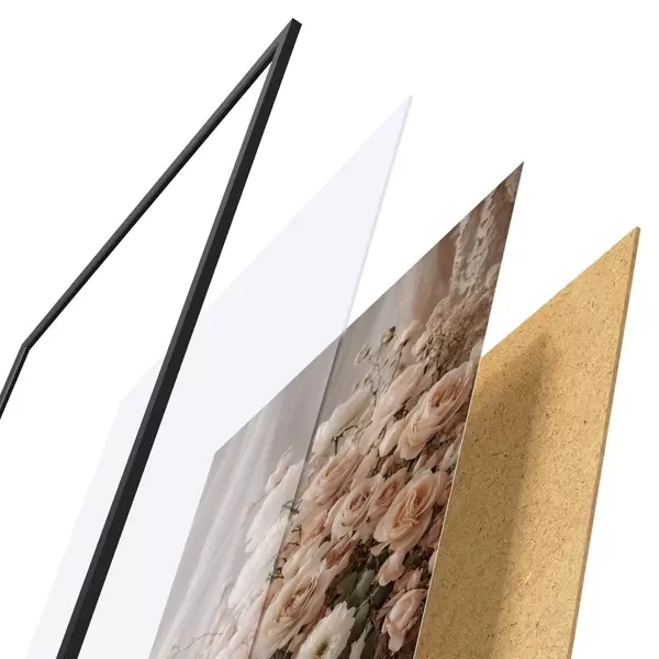 Plakat składa się z ramy, pleksi, wydrukowanego obrazu i podkładu z płyty wiórowej. Plakat można natychmiast zawiesić na ścianie dzięki uchwytom z tyłu.