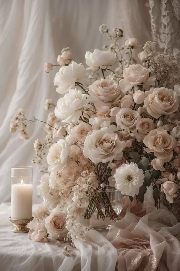 Plakat Kremowe kwiaty obok zapalonej świecy f47281