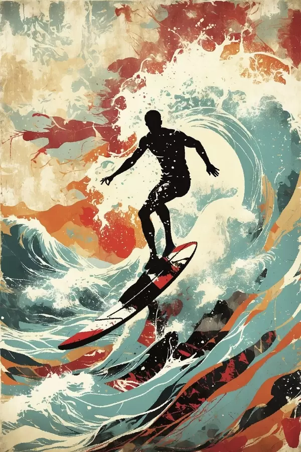 Poster Sylwetka surfera na falach w żywych kolorach Nr f47284