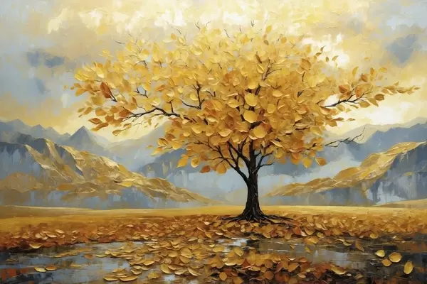 Plakat Drzewo z żółtymi liśćmi w górskiej scenerii f47285
