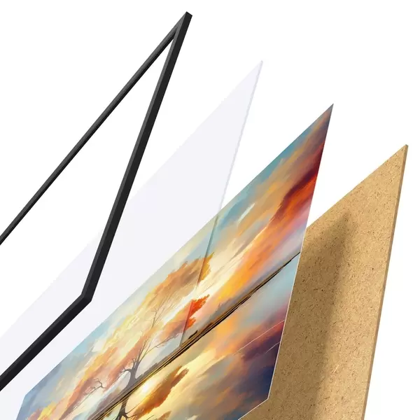 Plakat składa się z ramy, pleksi, wydrukowanego obrazu i podkładu z płyty wiórowej. Plakat można natychmiast zawiesić na ścianie dzięki uchwytom z tyłu.