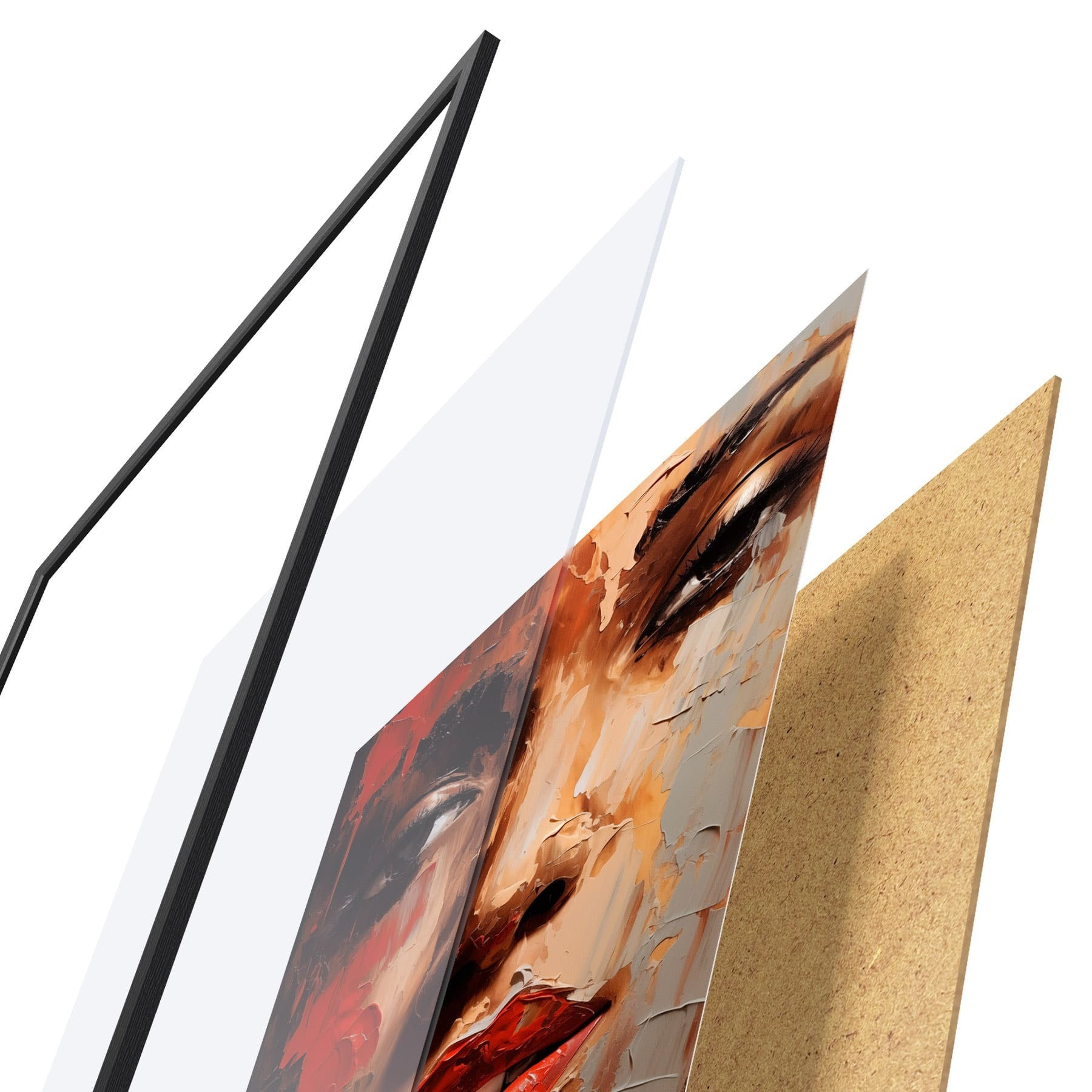 Plakat składa się z ramy, pleksi, wydrukowanego obrazu i podkładu z płyty wiórowej. Plakat można natychmiast zawiesić na ścianie dzięki uchwytom z tyłu.