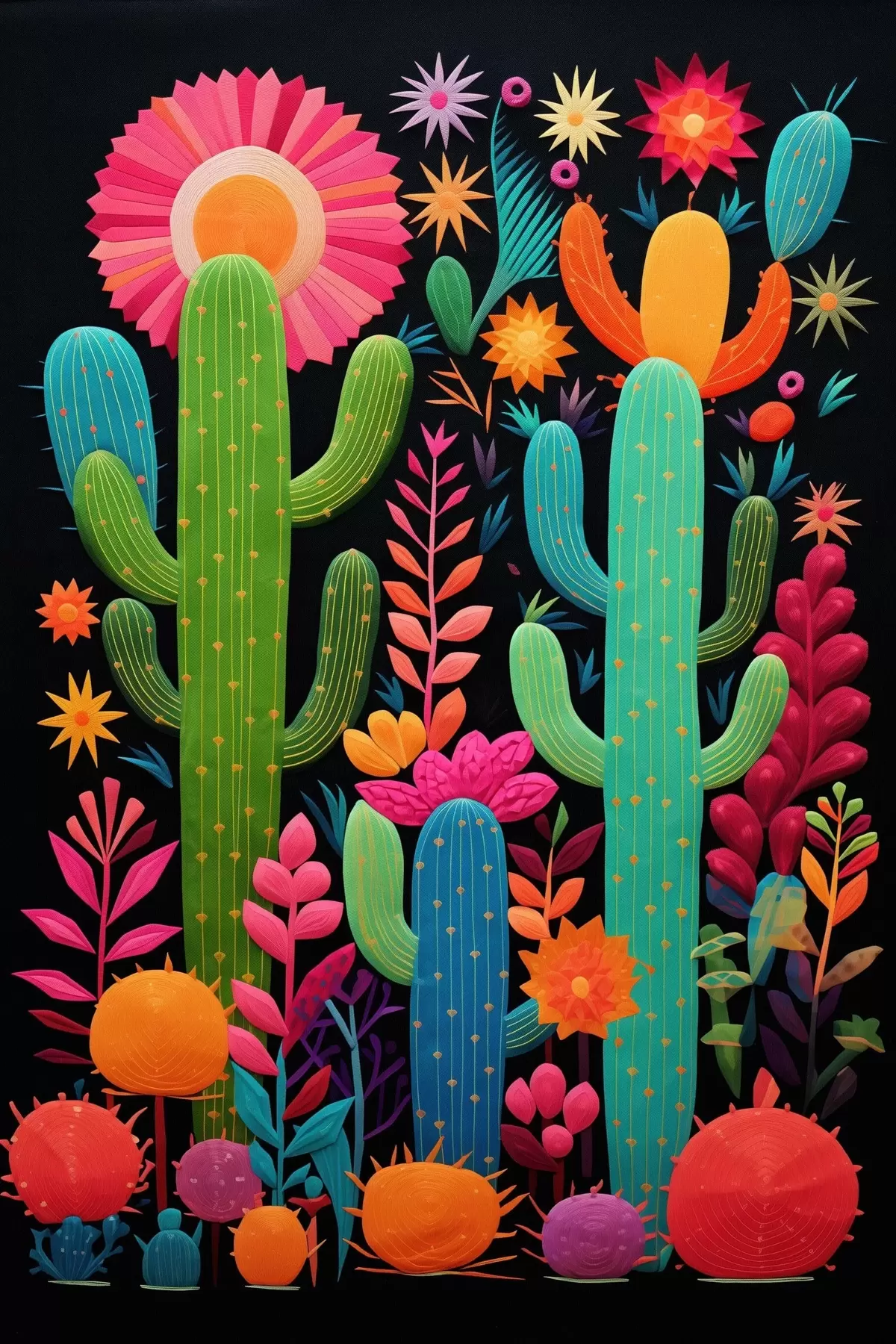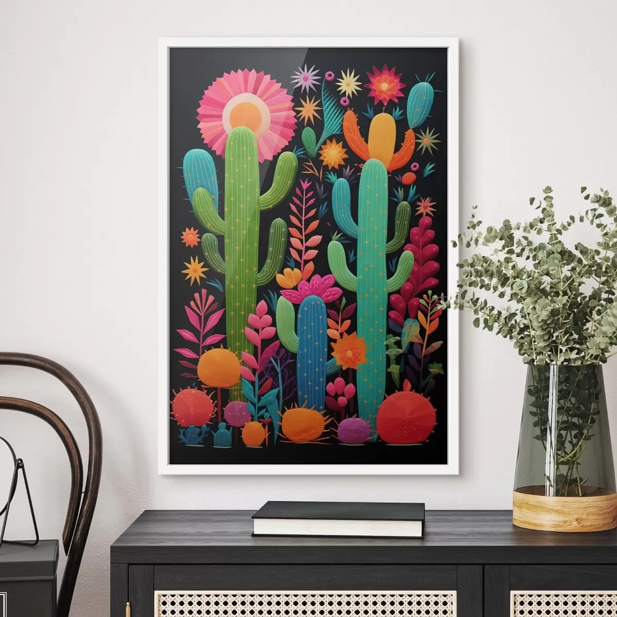 Plakat Żywe kaktusy i kwiaty na ciemnym tle f47297