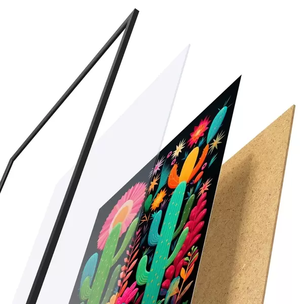 Plakat składa się z ramy, pleksi, wydrukowanego obrazu i podkładu z płyty wiórowej. Plakat można natychmiast zawiesić na ścianie dzięki uchwytom z tyłu.