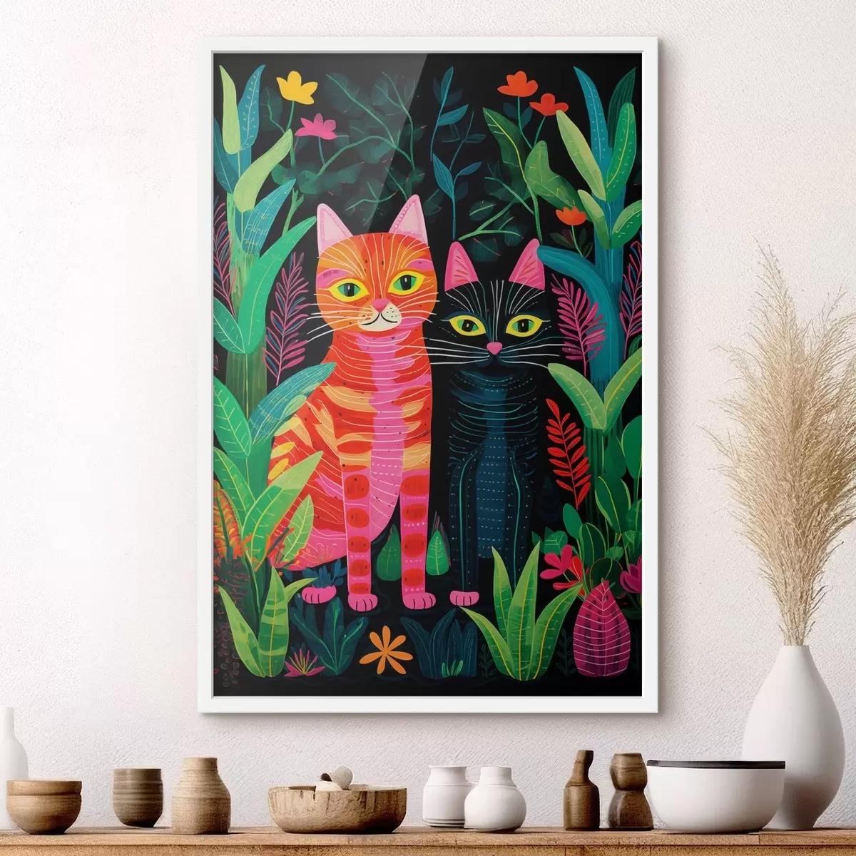 Plakat Dwa stylizowane koty wśród bujnych roślin f47298