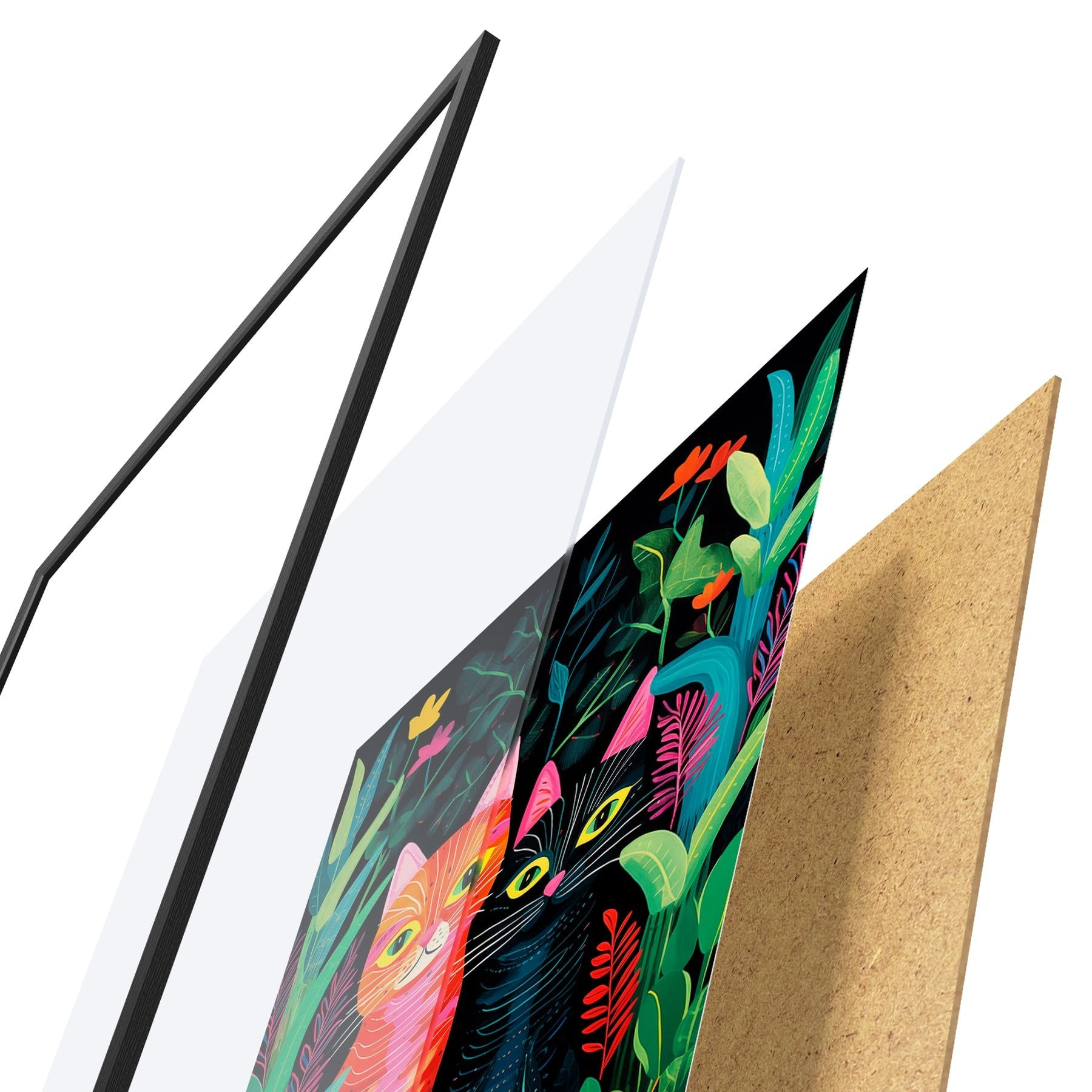 Plakat składa się z ramy, pleksi, wydrukowanego obrazu i podkładu z płyty wiórowej. Plakat można natychmiast zawiesić na ścianie dzięki uchwytom z tyłu.
