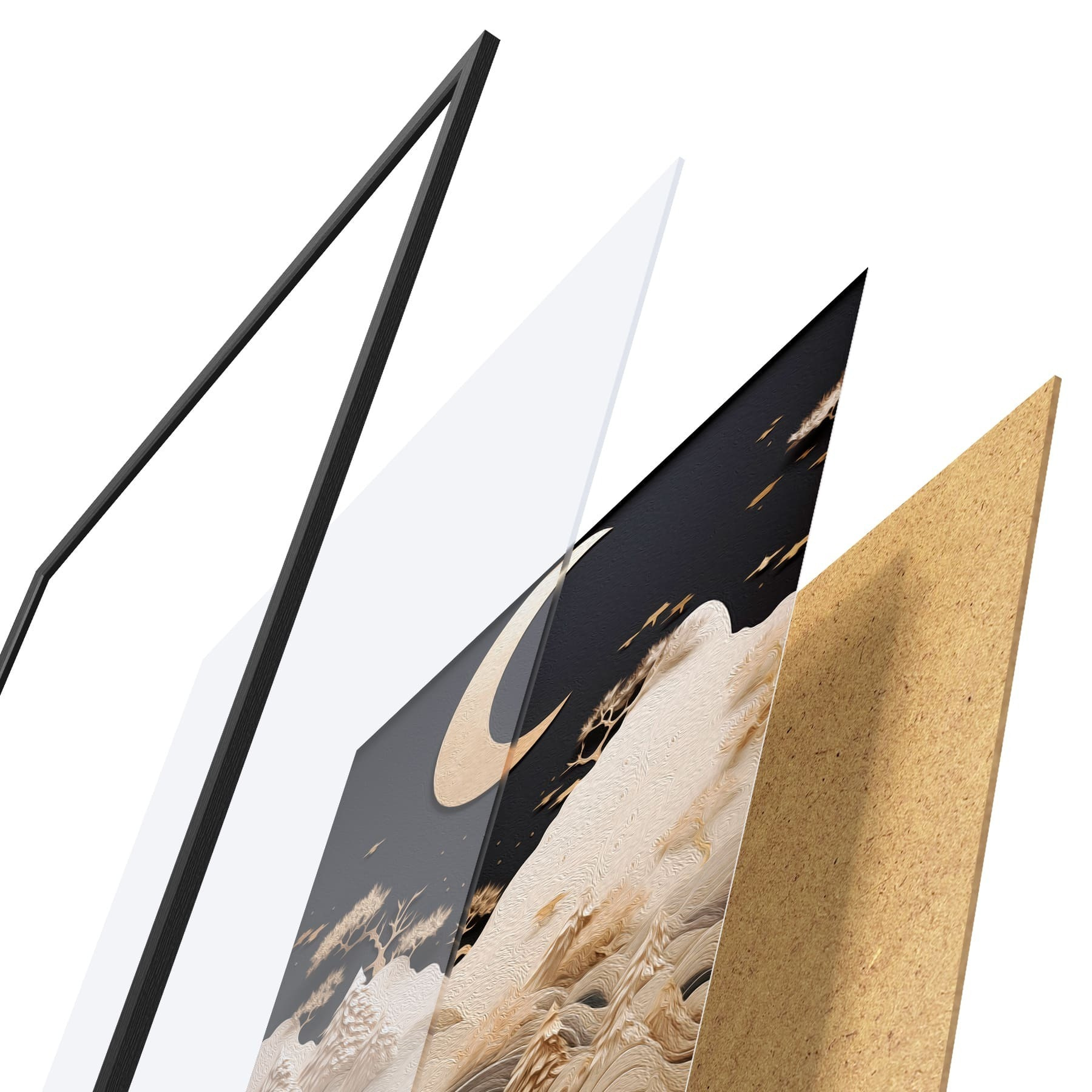 Plakat składa się z ramy, pleksi, wydrukowanego obrazu i podkładu z płyty wiórowej. Plakat można natychmiast zawiesić na ścianie dzięki uchwytom z tyłu.
