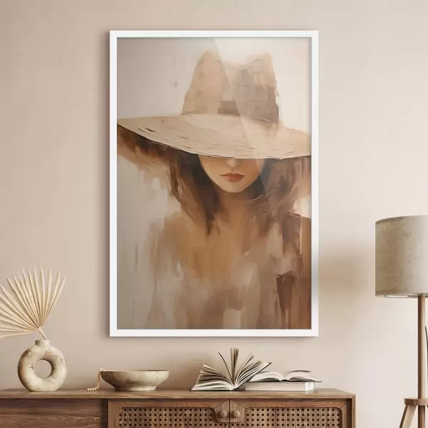Poster Kobieta w kapeluszu namalowana ciepłymi, abstrakcyjnymi pociągnięciami pędzla Nr f47312