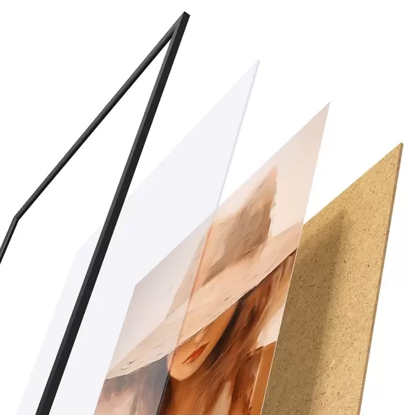 Plakat składa się z ramy, pleksi, wydrukowanego obrazu i podkładu z płyty wiórowej. Plakat można natychmiast zawiesić na ścianie dzięki uchwytom z tyłu.