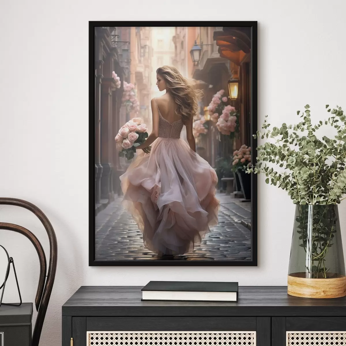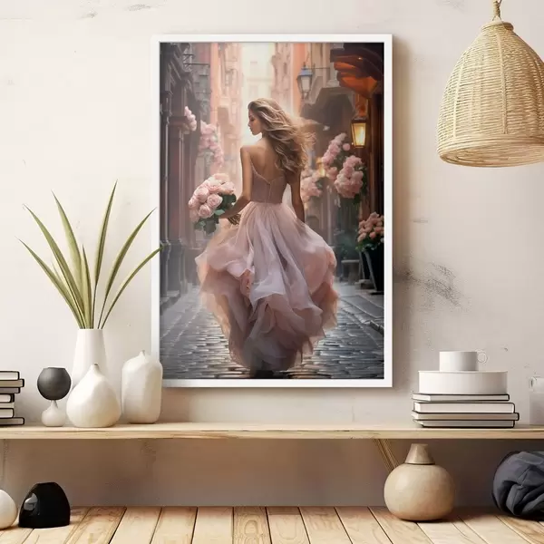 Plakat Kobieta w różowej sukience idąca ulicą f47316