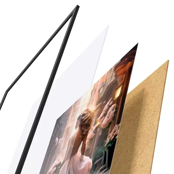 Plakat składa się z ramy, pleksi, wydrukowanego obrazu i podkładu z płyty wiórowej. Plakat można natychmiast zawiesić na ścianie dzięki uchwytom z tyłu.