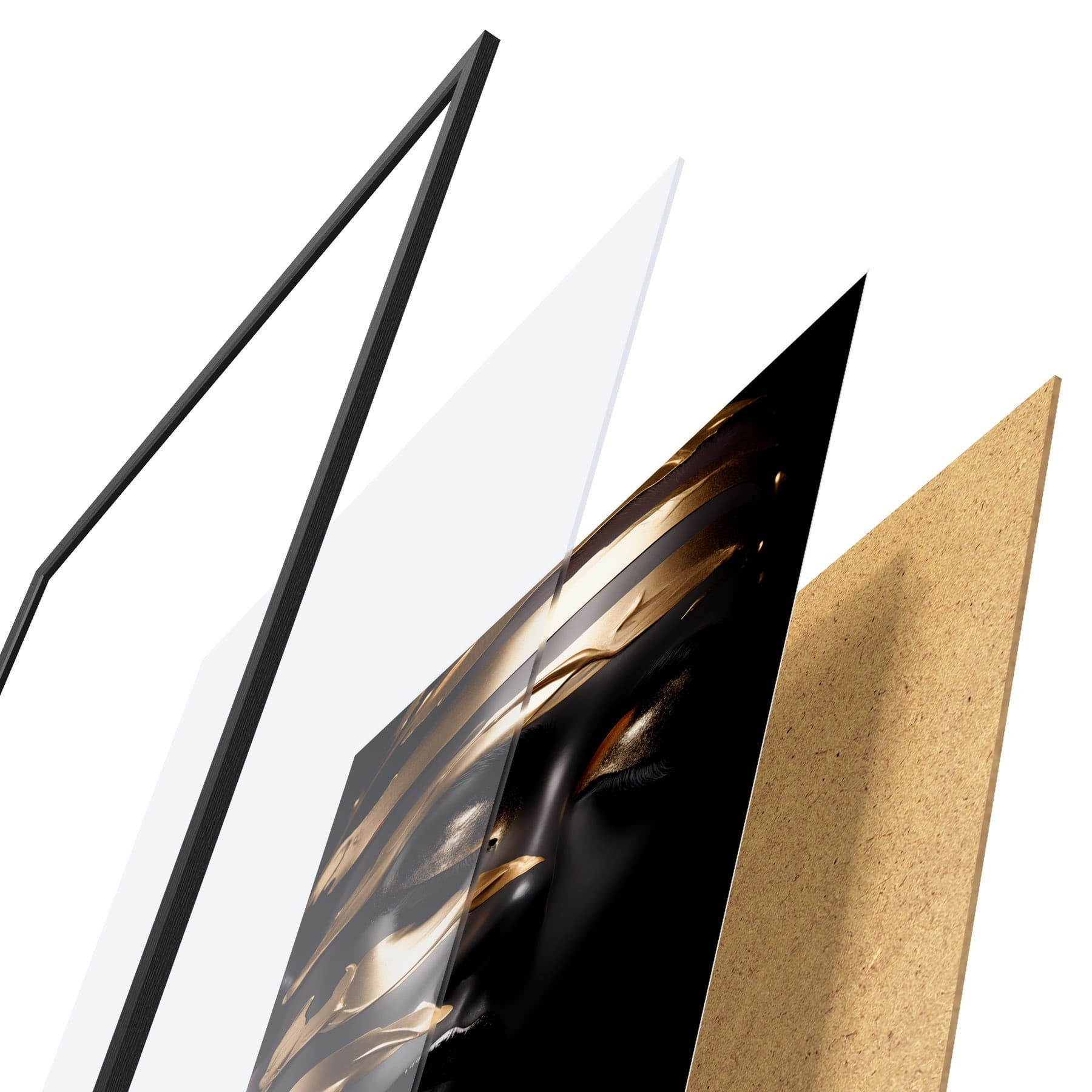 Plakat składa się z ramy, pleksi, wydrukowanego obrazu i podkładu z płyty wiórowej. Plakat można natychmiast zawiesić na ścianie dzięki uchwytom z tyłu.