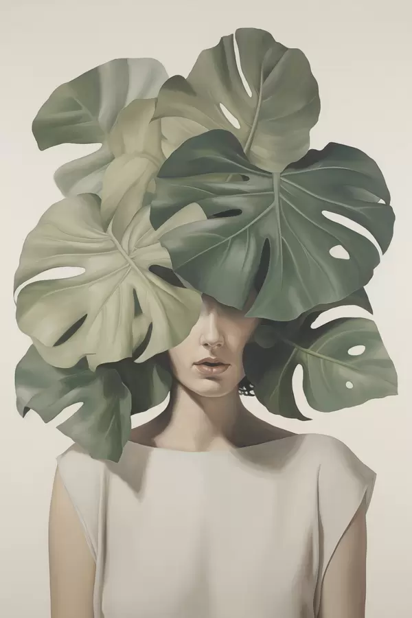 Plakat Abstrakcyjny portret dziewczyny z liśćmi monstery f47336