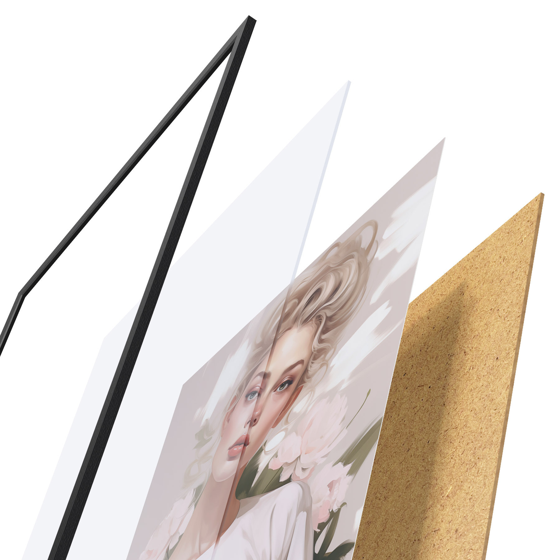 Plakat składa się z ramy, pleksi, wydrukowanego obrazu i podkładu z płyty wiórowej. Plakat można natychmiast zawiesić na ścianie dzięki uchwytom z tyłu.