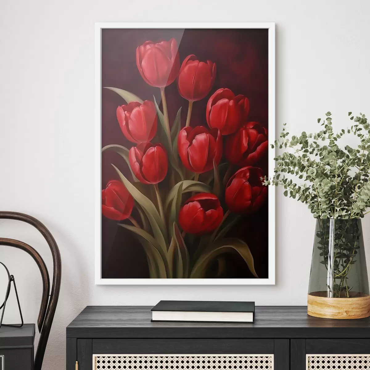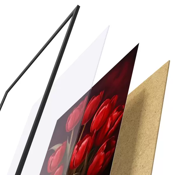 Plakat składa się z ramy, pleksi, wydrukowanego obrazu i podkładu z płyty wiórowej. Plakat można natychmiast zawiesić na ścianie dzięki uchwytom z tyłu.
