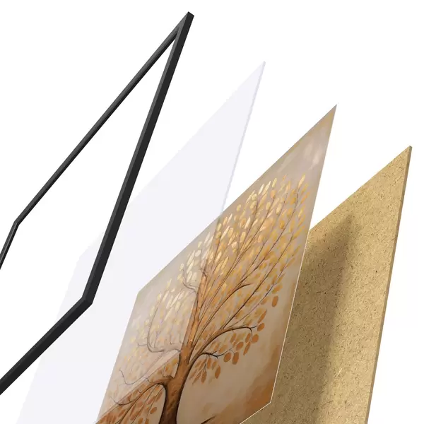 Plakat składa się z ramy, pleksi, wydrukowanego obrazu i podkładu z płyty wiórowej. Plakat można natychmiast zawiesić na ścianie dzięki uchwytom z tyłu.