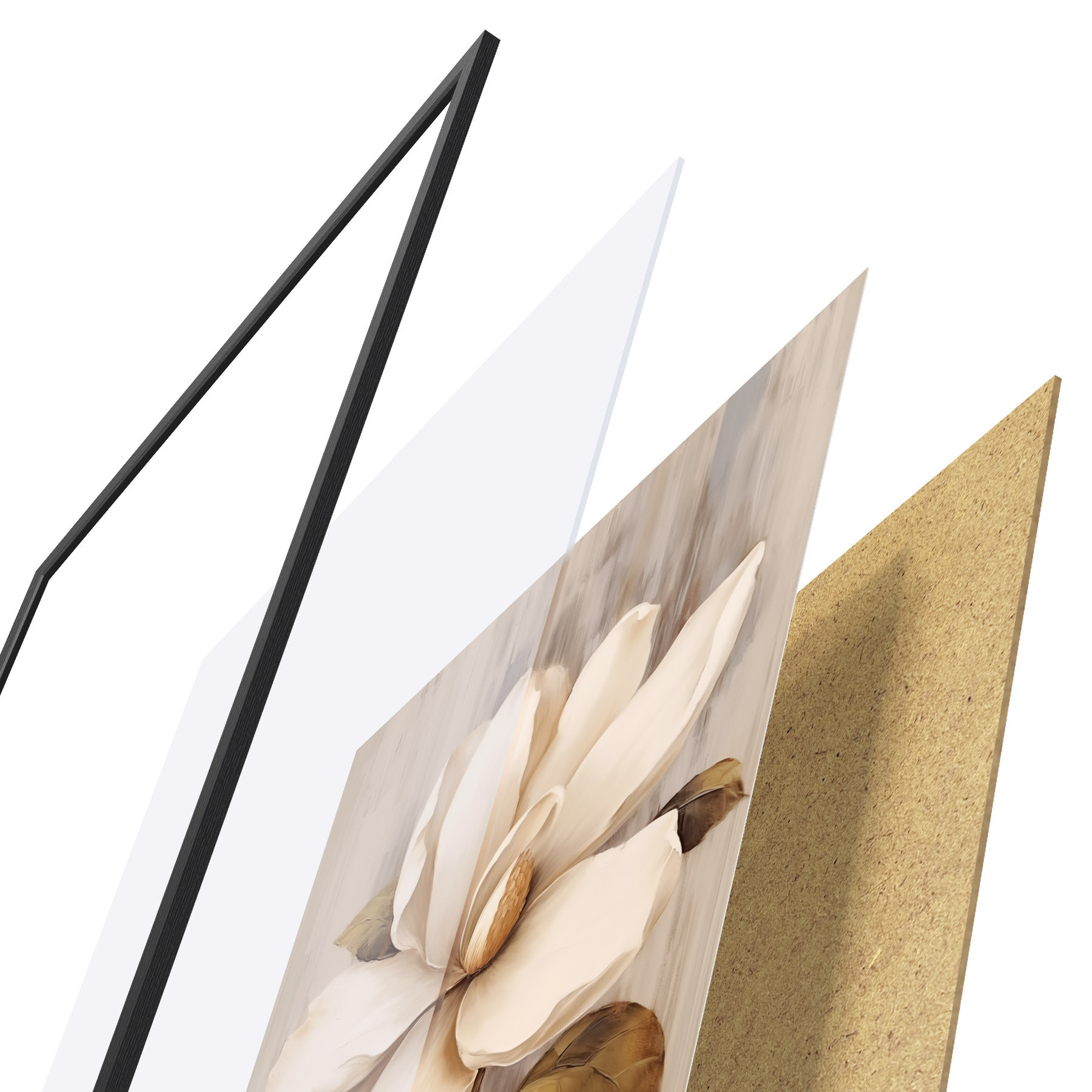 Plakat składa się z ramy, pleksi, wydrukowanego obrazu i podkładu z płyty wiórowej. Plakat można natychmiast zawiesić na ścianie dzięki uchwytom z tyłu.