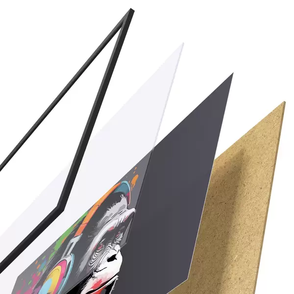 Plakat składa się z ramy, pleksi, wydrukowanego obrazu i podkładu z płyty wiórowej. Plakat można natychmiast zawiesić na ścianie dzięki uchwytom z tyłu.