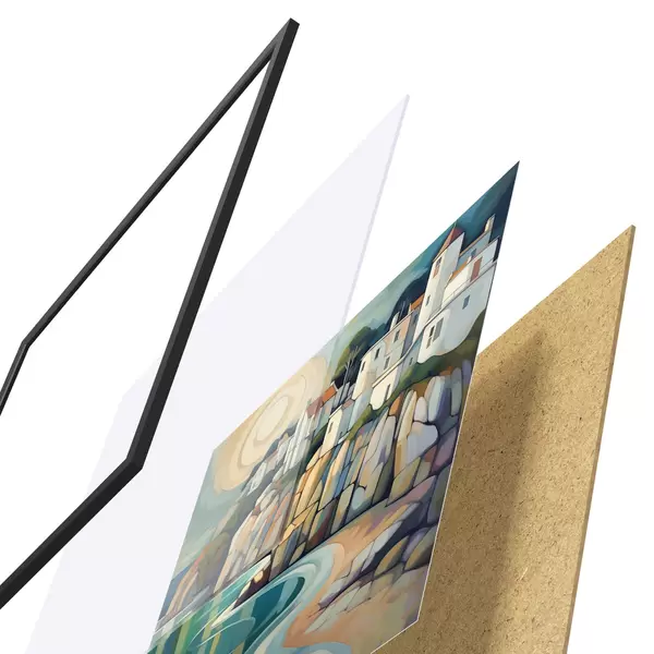 Plakat składa się z ramy, pleksi, wydrukowanego obrazu i podkładu z płyty wiórowej. Plakat można natychmiast zawiesić na ścianie dzięki uchwytom z tyłu.